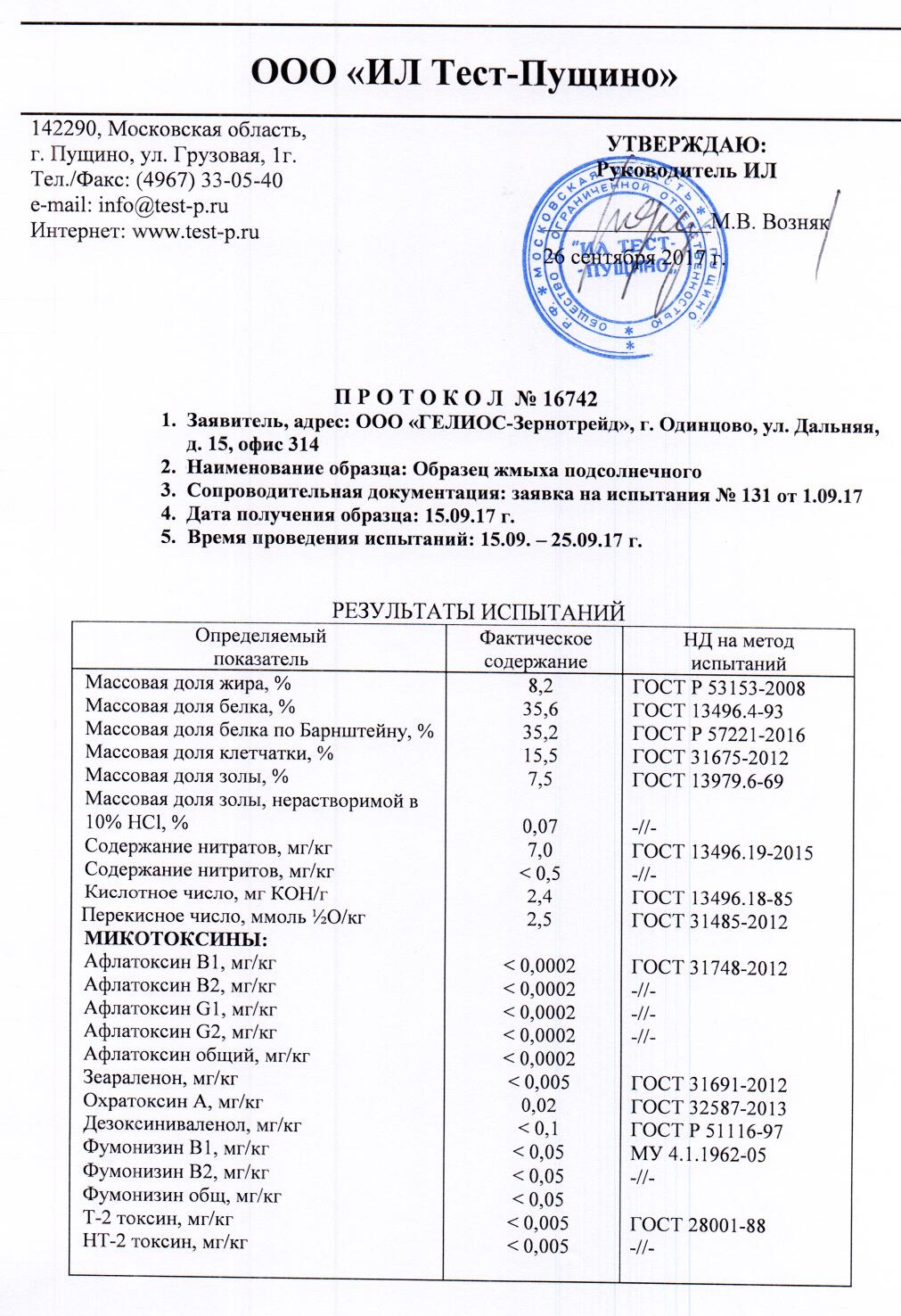 Протокол испытания жмыха подсолнечного поставляемого нашим покупателям.